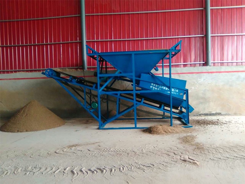 整個設備由原料儲料斗、原料供料皮帶機、平置篩網、成品砂堆料皮帶、棄石出料槽等組成,設備通電運轉后由裝載機將原料裝入大容量儲料斗,原料經由供料皮帶投入到平置篩筒,旋轉的篩筒帶動原料在筒內葉片的推擠、翻滾下形成原料在篩網面滑滾的人工篩砂效果,篩出的成品砂通過集料斗落在成品砂皮帶上,同時被皮帶提升落下呈成品料堆、或直接落入儲料斗,整個過程連續且物料分級清楚。